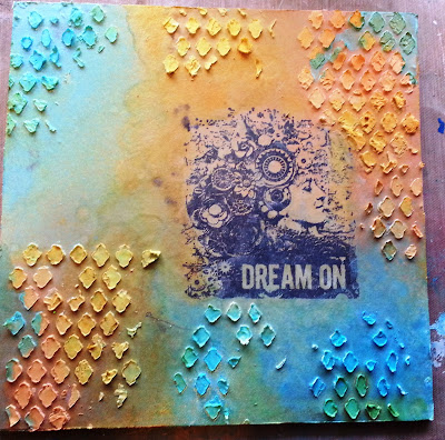 black and add Modelling Paste in random areas using the stencil. When dry add more colour.