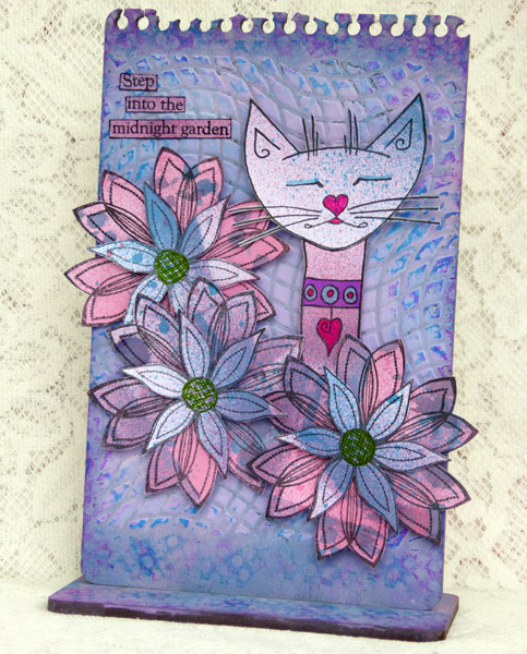11:00Hello! I have another mixed media upright to share this week which uses up most of the scraps of my spray overflow paper from last week and I couldn't resist inking up Donna's cute Bentley to go with my flowers as it's quite a while since he made an appearance. The colours are a little more dusk than midnight but Bentley does look rather sleepy!