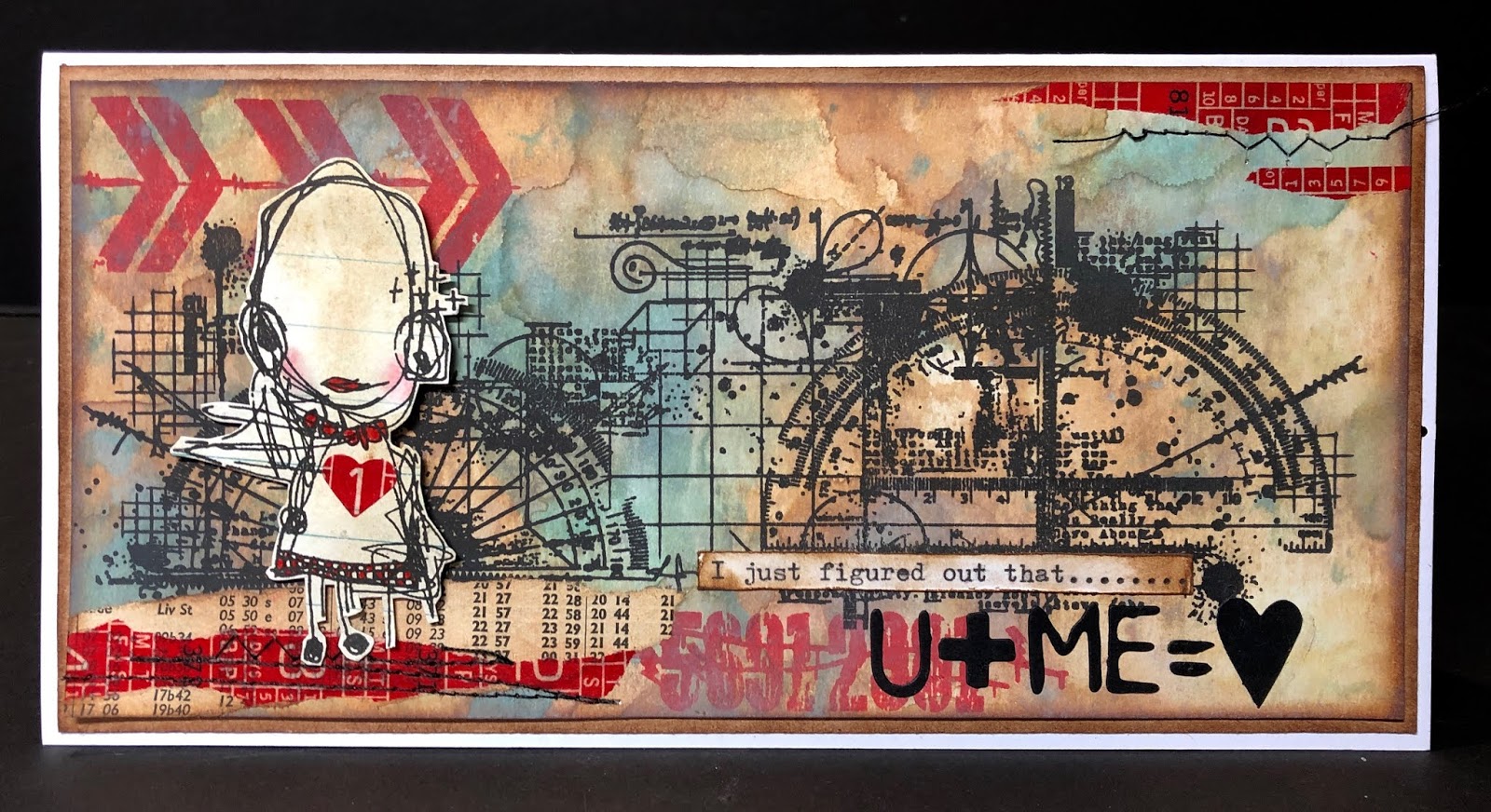 An absolutely scrumptious background - Oxides and stamping both included in that - and I love the quirky little character figuring stuff out.