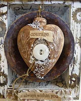 An Affirmation was partially inked up onto scrap/found piece of card, lightly stained with Walnut Ink Crystals. This was torn, with "courage" adhered above the heart recess.