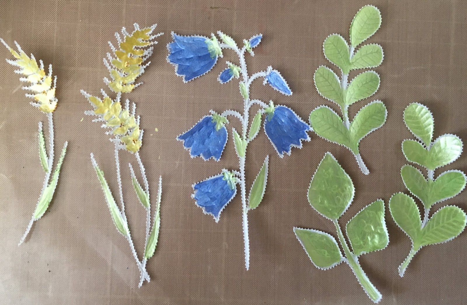 I started by stamping the Campanula, grass, and leaves onto parchment using a white pigment ink.