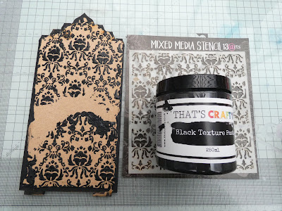 I took a That's Crafty! MDF Upright and applied That's Crafty! Texture Paste through a 13 Arts Ornamental Stencil and left to dry. Once dry I covered the entire piece including the base with That's Crafty! Black Gesso I then added Vintage Gold Wax Paste by Finabair through the stencil and around the edges.