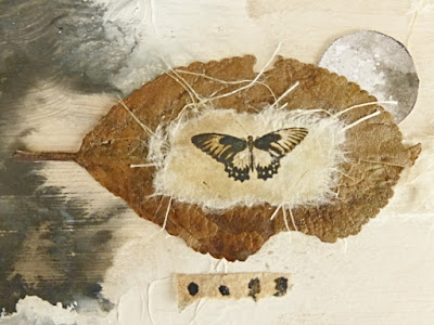 For this page, torn butterflies layered to a dried leaf. Again, waste from the holes of the journal are used as detail on the page.