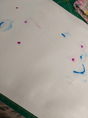 To decorate the cartridge paper I spritzed with a little water then added some drops of Art by Marlene Acrylics in Fuschia and Smurf, blending to create a soft background. I dried with a heat gun, then spritzed with water again and added Hot Curry, blending and blotting off with a tissue.