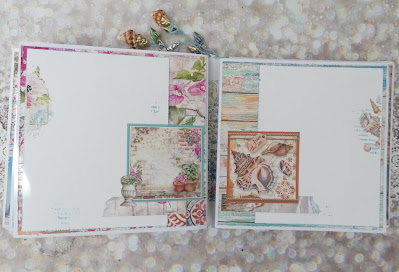 11:00Before long we will be turning our thoughts to holidays by the sea and the Blue Dream collection is just perfect for making an album to hold precious photographs and ephemera collected whilst away. The base of this album are two 6"square canvases linked by a piece of canvas 3" wide by 8" tall adhered to the inside of the canvas panels and then lined with paper before folding over the top and bottom 1" pieces so that the edge is neat. The backs of the canvases were then covered with more papers leaving just a tiny border.