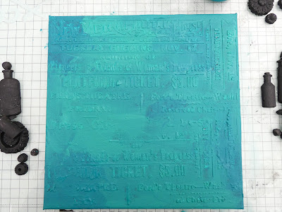 The base of this make is an 8" square canvas that I primed with black Primer Paste I before adding some Modeling Paste through the new Theater Night stencil.